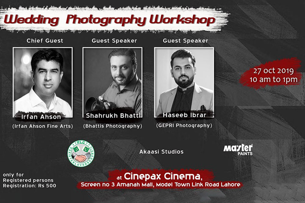 PLC (Pakistan Lovers council) is in collaboration with Akaasi Studios and organizing a Wedding Photography Workshop for Wedding photographers on 27 oct 2019 from morning 10:30 am to 2 pm at Cinepax Cinema, Screen no 3 Amanah Mall Model town link Road Lahore.